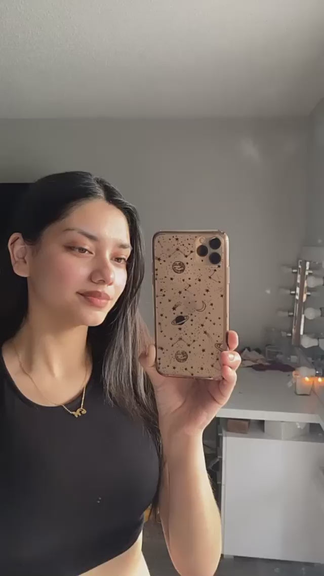 This sleek Galaxy Transparent iPhone case protects your phone from scratches, dust, oil, and dirt. It has a solid back and flexible sides that make it easy to take on and off, with precisely aligned port openings.